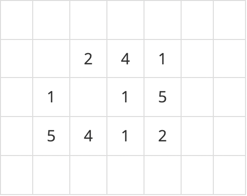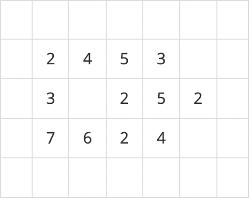 지구 온난화로 인하여 북극의 빙산이 녹고 있다. 빙산을 그림 1과 같이 2차원 배열에 표시한다고 하자. 빙산의 각 부분별 높이 정보는 배열의 각 칸에 양의 정수로 저장된다. 빙산 이외의 바다에 해당되는 칸에는 0이 저장된다. 그림 1에서 빈칸은 모두 0으로 채워져 있다고 생각한다.